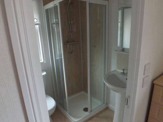 The main bedroom is fitted with freestanding bedside cabionets and two large chest of drawers. it also has a large walk in wardrobe and en-suite fitted with water resistant vinyl flooring, sink unit with a tiled splashback and a large corner shower.